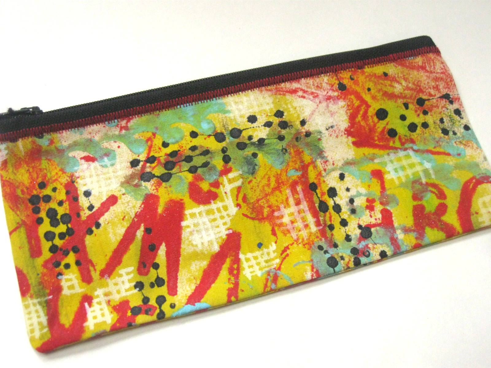 Not a new idea, but I love breaking free and doing some messy painting. I find it relaxing to not worry about straight lines and creating a "perfect" painting. These pouches are where I really get to play with color and pattern! To my surprise, colors I thought I didn't "like" have become some new favorites. I'm also learning to use new tools - like stencils, brayers, hex nuts, coffee cups - whatever I can apply paint with! The dots below were made with my fingers, then I used a cup to stamp the larger circles. Other favorite tools are bubble wrap, corrugated cardboard, and paint pens.
